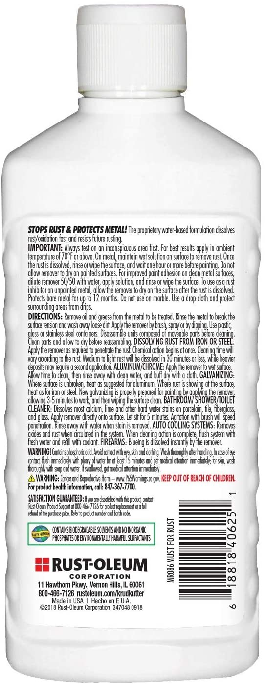 THE MUST FOR RUST - RUST REMOVER & INHIBITORThe proprietary formulation penetrates into every void of a metal surface and dissolves rust/oxidation through chemical action. Then tiny, rust-inhibiting crystals are formed and become integral with the surface molecules of the metal to resist future rusting. The corrosive agents attack these crystals instead of the metal. Once completely dry, the surface is ready for the next step, whether it be painting, welding, plating, lubricating, etc. Or simply leave the surface bare, and the crystals will inhibit future rust formation.